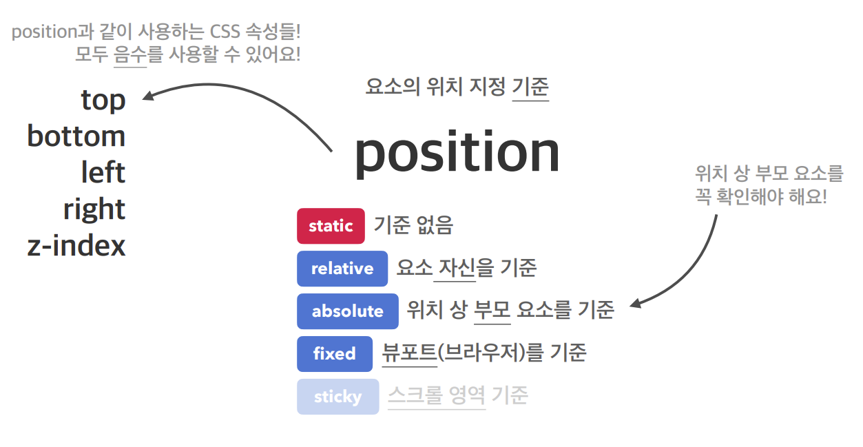 - position:sticky - 부모 요소 안에서만 동작함. top, left, right, bottom 중 하나의 값 설정은 필수