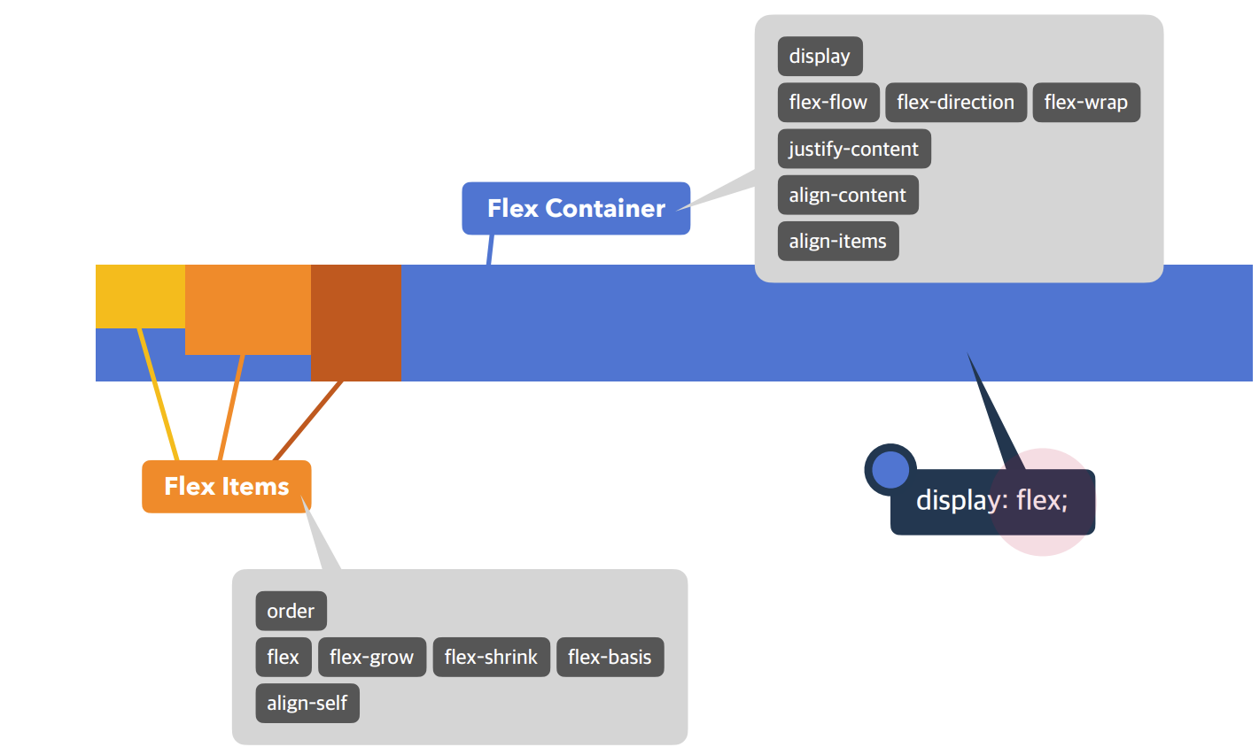 -> 중요한 개념은 display 부분에 flex라는 값이 들어있는 요소는 flex container고, 자식 요소들은 flex items이고, 각각 속성을 따로 부여할 수있음