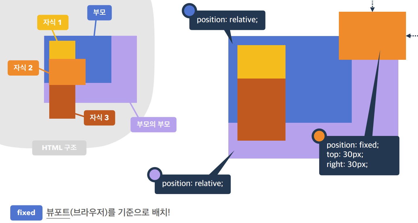위치상 부모요소를 기준으로 배치되는데 항상 부모요소 기준으로 배치되는 게 아님(뷰포트 기준으로 배치도 될 수 있음)