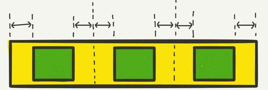 space-between : 첫번째 아이템을 주축의 시작점, 마지막 아이템을 주축의 끝점, 빈 공간들은 균등하게 분배
