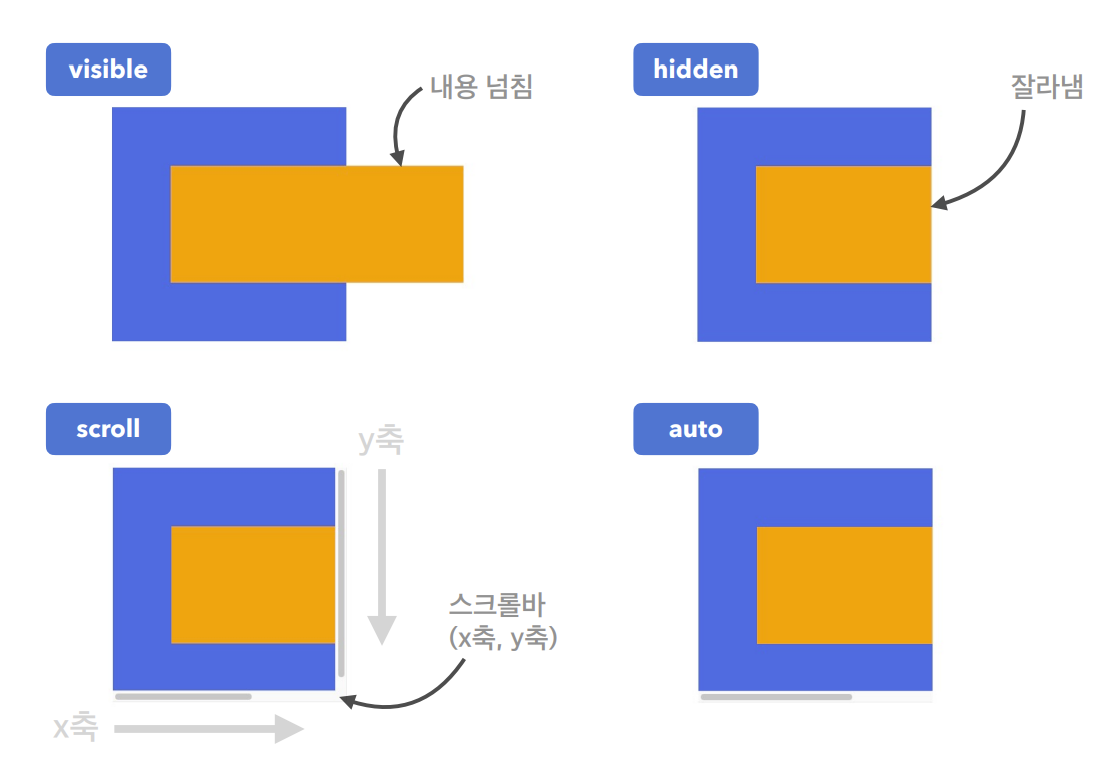 - 요소의 크기 이상으로 내용이 넘쳤을 때, 보여짐을 제어하는 단축 속성