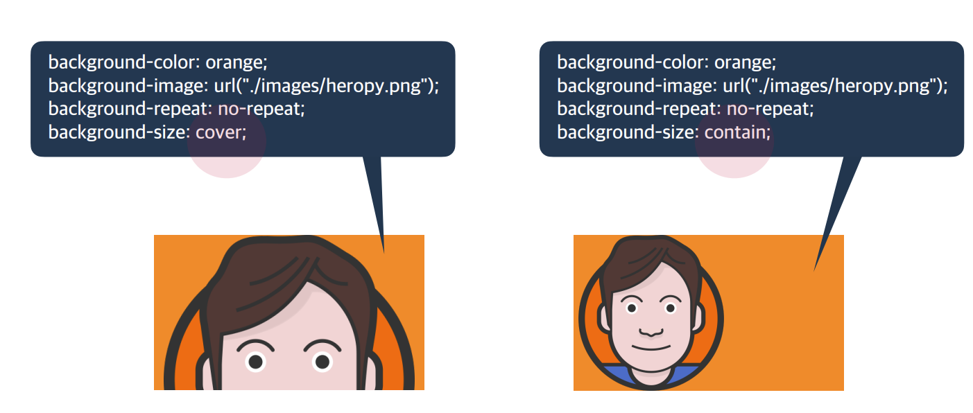 - background-size : auto, 단위, cover(비율을 유지, 요소의 더 넓은 너비에 맞춤), contain(비율을 유지, 요소의 더 짧은 너비에 맞춤)